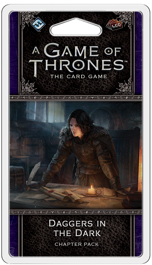 Daggers in the Dark is the sixth Chapter Pack in the Dance of Shadows cycle for A Game of Thrones: The Card Game. Featuring three copies each of twenty distinct cards, this pack draws you into the pages of A Song of Ice and Fire, where the key characters in the story find themselves surrounded by enemies as the shadows encroach. At the Wall, Jon Snow struggles with his duties as Lord Commander of the Night's Watch as his brothers whisper dissension. In King's Landing, Cersei Lannister attempts to keep the loyalty of the smallfolk as the Faith Militant stirs rebellion. And in Meereen, Daenerys Targaryen makes difficult sacrifices to win the hearts of the Meereenese as assassins plot her demise. With the return of the shadows mechanic from A Game of Thrones: The Card Game First Edition, your games become further steeped in mystery and intrigue as the paranoia threatens to tear you apart. With dangers at every turn, you must embrace the darkness or fall before those who do. How much of yourself are you willing to lose in order to win the Iron Throne?