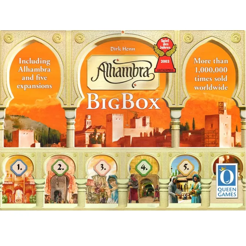 One big box containing the Alhambra base game plus all five of its current expansions. Its packaging is designed to store the expansions separately.