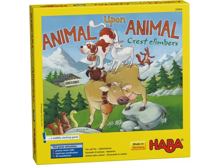 Climbing in the Alps! Today the mountain animals want to prove how sporty they are. Who is able to place the Saint Bernard on top of the cow and then pile the groundhog and squirrel on top? Phew! But the snake also wants to wriggle to the top of the pile. What dizzy heights! Contents: 1 mountain panorama, 4 Saint Bernards, 4 cows, 4 marmots, 4 squirrels, 4 goats, 4 snakes, 4 pine trees, 1 die with symbols, Set of game instructions.