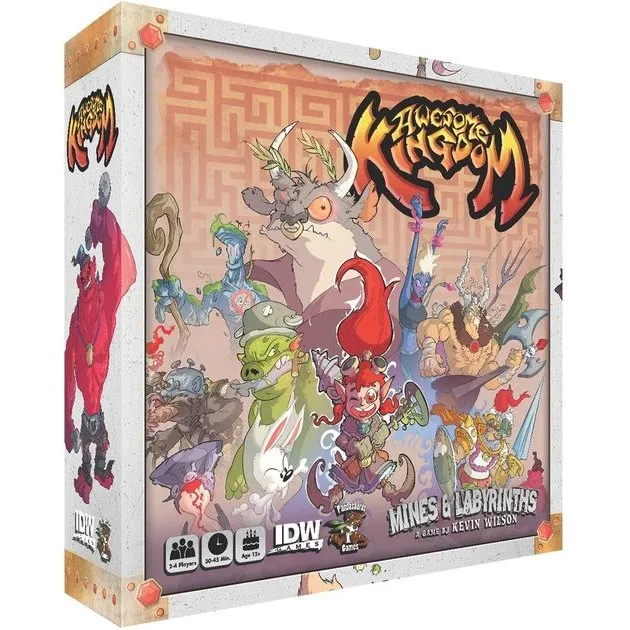 Awesome Kingdom: Mines & Labyrinths is a lightweight, fast and funny dungeon-crawling card game in which players compete to be the most awesome hero after three days of adventuring. Players enter the dungeon as one of eight epic characters, such as the Ragebarian, Prestidigimancer, or Paladude, with each character being bestowed with an appropriately amazing ability. The dungeon is formed out of a circle of dungeon wall tiles, with dungeon cards filling most of those spaces and heroes filling the rest. A day lasts three turns, and on a turn, you play an action card from your hand, normally moving your hero around the circle of cards (skipping over other heroes) and claiming the card on which you land, which could be treasure, a monster (which wounds you before you defeat it), a trap, or even a magic item. Cards are worth various amounts of awesomeness, and you want to be the most awesome hero at the end of the third day. Awesome Kingdom: Mines & Labyrinths is both a standalone game and an expansion for Awesome Kingdom: The Tower of Hateskull, with two new dungeons for heroes to explore: Cretin's Labyrinth and the Mines of Murray.