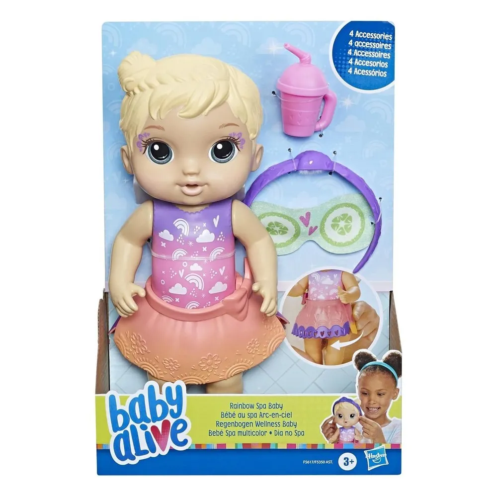 It’s a make-believe spa day for Baby Alive Rainbow Spa Baby doll! This 10-inch Baby Alive doll comes with a cute cucumber-inspired doll eye mask. It’s a fun spa-themed toy for girls and boys featuring a vibrant dual-sided skirt kids can twist and create a different look. Rainbow Spa Baby doll for kids ages 3 and up also includes a matching headband and a play bottle so kids can pretend to feed her. With 5 points of articulation, this poseable doll makes a fantastic present for birthdays and holidays.