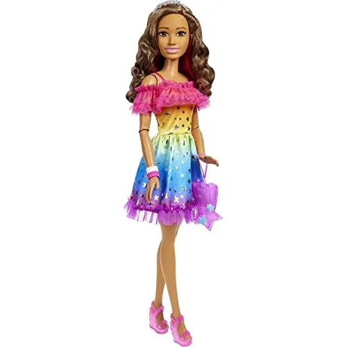 This poseable, large Barbie doll has the same Barbie charm that kids know and love, but expanded to a 28-inch-tall frame. After all, more Barbie means even more fun! She rocks a rainbow dress that shines with stars, and carries a purple purse that can store her included headband and bracelet accessories. Doll cannot stand alone. Colors and decorations may vary.