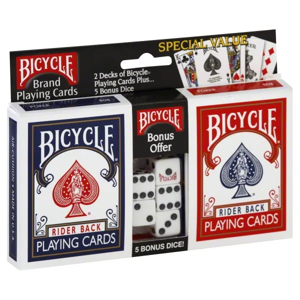 Bicycle Standard Playing Cards Poker Size 2 Pack with 5 bonus dice. Each Bicycle deck consists of 52 traditional suited playing cards two jokers and two additional ad cards. Great for all card games including Poker Canasta Rummy Pinochle Euchre Hearts Blackjack Go Fish Baccarat and many more!