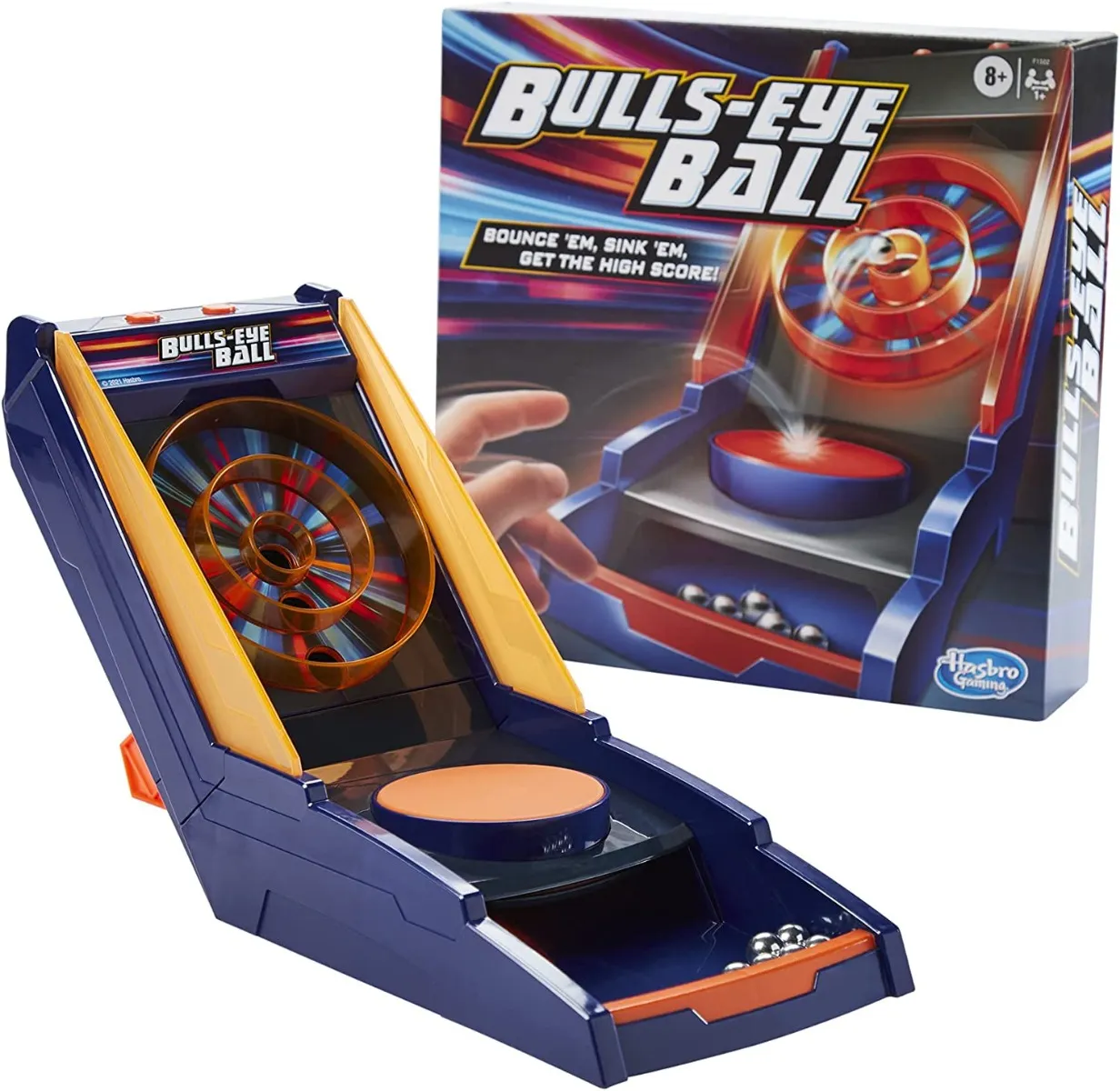 Watch out—it only takes a few moments to get hooked on this game. Like skee-ball, but with bounce, the trick of the game is to bounce the balls off the built-in trampoline and into the target. But it's not as easy as it sounds. Play 30-Second Blitz to see how many points you can score in 30 seconds, 25-Point Rush to see how quickly you can score the points, or Bulls-Eye Ace to see how many bulls-eyes you can get before missing 10 times. A comical character calls the play-by-play, while cool music and lively sound effects keep the adrenaline pumping. Features a practice mode and high score memory. Includes 1 Bulls-Eye Ball electronic talking target game unit and 10 silver metal balls. Imported. 11Lx6Wx6-1/2H".