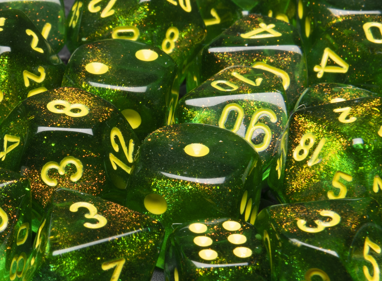 This Chessex dice set is simple and easy to read maple green color with yellow numbering. Great for people beginning a die collection or just looking for a new dice set to increase their rolling options.