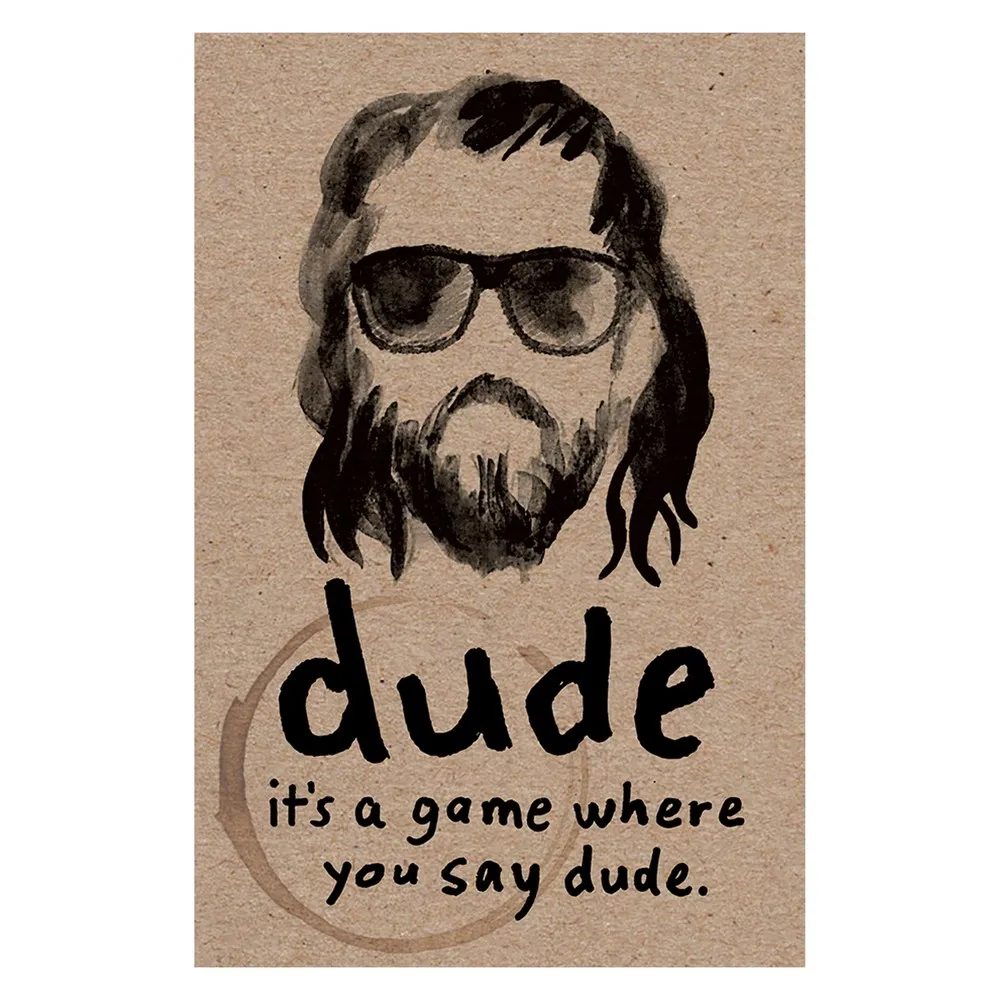 dude is a game where you say "dude". The word "dude" appears on each card in one of six different ways, with 12 dooode cards, 12 dewd cards, 12 dude. cards, 12 dude? cards, 12 tiny dude cards, and 12 tie-dyed dude cards. The goal is to quickly find matches for as many of your cards as you can. To play, you say the word "dude" as you think it should be said, based on how it appears on your card. At the same time, listen to how the other players are saying the word "dude". Trying to figure out whether you have the same card as another player is the essence of dude.