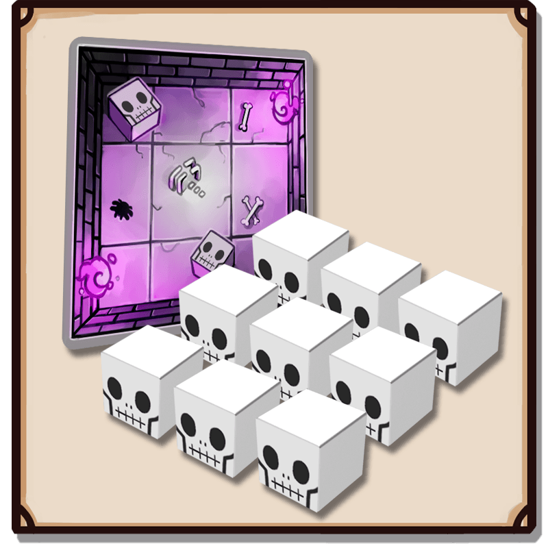 Heads will roll with this rattling mini-expansion of skulls and bones! While only a few skeletons will reside in the dungeon at first, they can quickly grow into an undead swarm. Includes 9 8mm wooden skeleton cubes with heat printing on 2 opposite faces, and a rules card that doubles as a crypt!