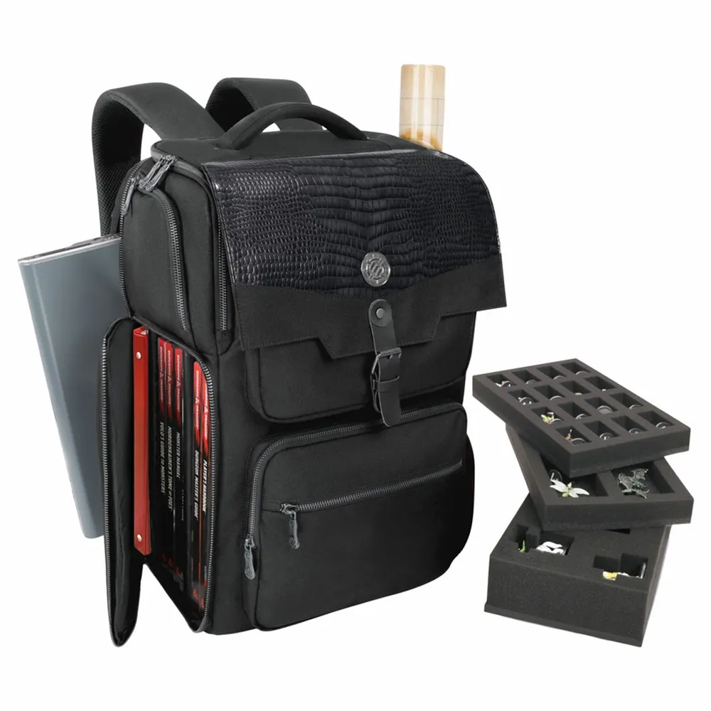 ENHANCE Collector's Edition DnD Backpack - RPG DM Bag for Dungeons and Dragons - DnD Bag fits 6-8 Books, 18" Laptop/DM Screen Slot, Miniature Foam Trays, Accessory Pockets, Map Strap DMs demand TTRPG travel storage large enough to carry more books, larger binders, DM screens, more figures, a laptop or tablet, and many more knick-knacks and snacks. ENHANCE's RPG Backpack stashes all of game night's adventuring loot as the ultimate TTRPG organizer and travel bag. How does it level up RPG transport even more? It has built-in padded backpack straps to make it the most practical bag of holding for any DM.