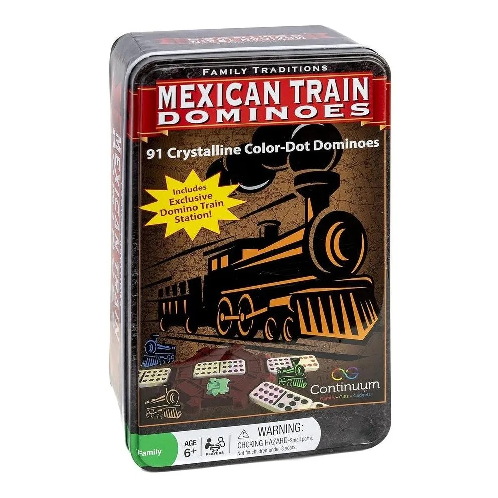 Mexican Train Dominoes is a popular game where players work to dispense all the dominoes in their hand by playing them onto one or more “trains” emanating from a central hub. The Mexican Train Dominoes Family Traditions Tin contains 91 crystalline dominos, plastic trains and train hub.
