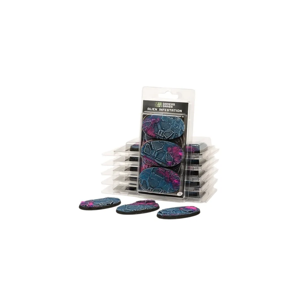 This blister contains 3 thermoplastic 75mm wide oval Battle Ready Base, in an Alien Infestation theme.