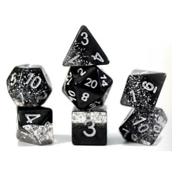 Two-tone polyhedral gaming dice set with a beautiful half & half design. Half one pearlescent and semi-translucent color, with a fine silver glitter in clear transparent resin for the other half. 7 dice per set includes: d4, d6, d8, d10, d10%, d12, d20 and comes in our exclusive Dice Keep. Easy-to-read numbering with classy precious-metal paint colors. Extra high density resin and high end dice molds make every Halfsies a near perfectly balanced die. Premium dice, at a price you can afford.