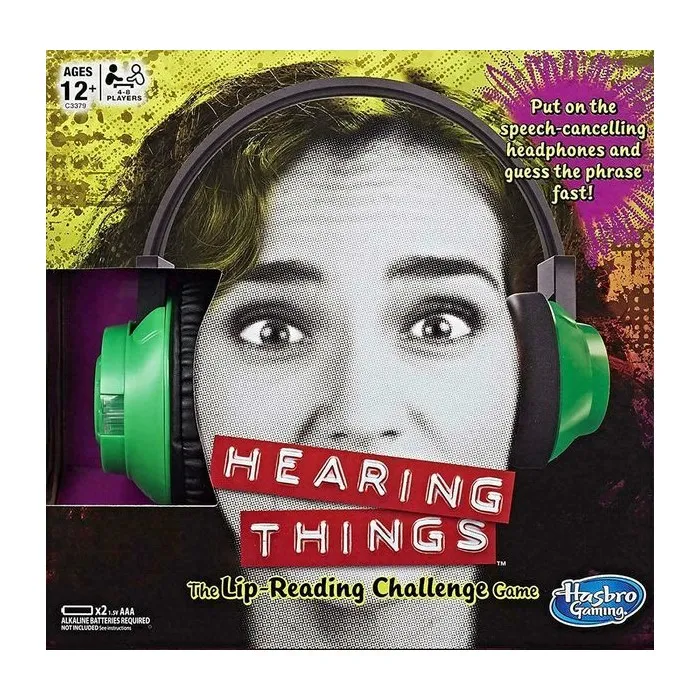 Players wearing noise-cancelling headphones guess aloud what random phrase off a card they think their teammate is whispering by reading that teammate's lips. Phrases include, "Pigeons like to cuddle" or "You're the champ of the camp".