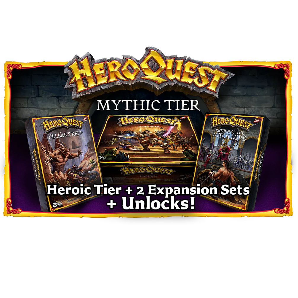 HeroQuest Mythic Tier All-in pledge includes everything from the Heroic Tier plus both expansions: