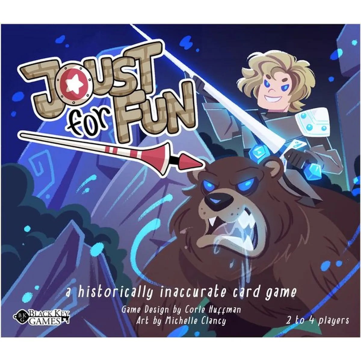Welcome to the zany world of Joust for Fun! To begin, gather your pun-riddled Knights, Yetis, Self-Rescuing Princesses, Luchadores, that ‘dude riding a giraffe’ (and many more)! On your turn, empower yourself with Court Cards that provide special abilities and then joust for FAN-tastic rewards! Joust for Fun's 2-4 player combat system combines elements of deduction, bluffing, and choice of how much damage you wish to inflict. The in-depth battle system allows you to strike with deceptively simple 1-5 valued combat cards! Just choose your attack wisely, if you aim to do (4) damage, and the opponent blocks with a (4), you’ll do no damage and gain no Fans! Joust for Fun is a complete strategy game that runs for about 20 minutes. In regular games, Joust for Fun lasts until a player collects 12 Fans (but you can also play the special royal decrees and scenario guided Jousts, wherein the victory condition changes and you may spend Fans for incredible bonuses)! Meet new friends like Sir Cumference of the Round Table, Dread Pirate Roberta, Sir Lances too Much, Lady Dun Waiting and Joust for Fun!