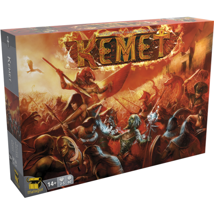 In Kemet, players each deploy the troops of an Egyptian tribe and use the mystical powers of the gods of ancient Egypt – along with their powerful armies – to score points in glorious battles or through invasion of rich territories. A game is typically played to 8 or 10 victory points, which may be accrued through winning attacks, controlling temples, controlling fully-developed pyramids, sacrificing to the gods, and wielding particular magical powers. The conquest for the land of Kemet takes place over two phases: Day and Night. During the day, choose an action amongst the nine possible choices provided by your player mat and perform it immediately. Once every player has taken five actions, night falls, with players gathering Prayer Points from their temples, drawing Divine Intervention cards, and determining the turn order before the start of the new day. As the game progresses, they can use Prayer Points to acquire power tiles. Some of these enroll magical creatures and have them join their troops. In addition to intimidating enemies, these creatures provide special powers! Detailed miniature components represent the combat units and the supernatural creatures that are summoned to enhance them. Combat is resolved through cards chosen from a diminishing six-card hand and enhanced by bonuses.