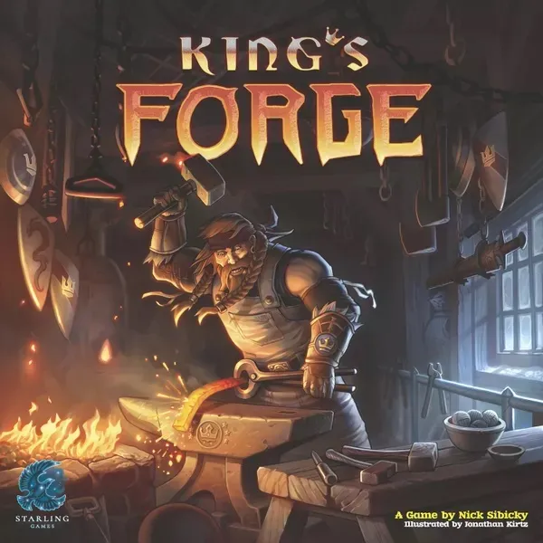 In King's Forge, players are craftsmen and craftswomen seeking to become the favorite of the King. A variety of dice represent the raw materials (metal, wood, gems, and enchantment) and those same dice can be used to gather new dice and purchase roll-modifiers, or saved and rolled in an attempt to meet the requirements to craft the items on the King's list. An early lead is not a sure path to victory and other players will out-maneuver and out-build you whenever possible. Careful dice management, advance planning, fierce competition, and nail-biting luck will carry you to winner's circle.