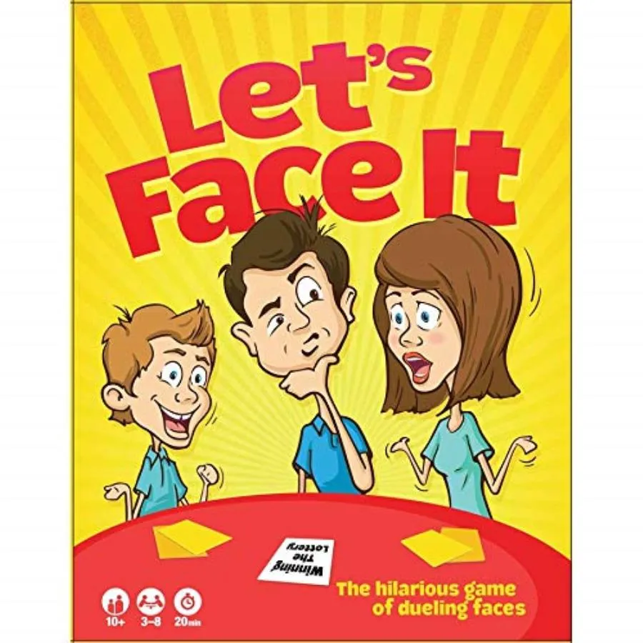 Lets's Face It is the exciting family game were players race around the board with the first player to cross the finish line is the winner. Each round, a player will flick the spinner to chooses an opponent to Face Off against. During the Face Off, a card will be revealed and both players in the Face Off will have five seconds to pose themselves to express what is written on the card. Winning the Lottery, Scoring the Winning Goal, Smelling Onions. Players who are not part of the Face Off choose the winner who gets to move his pawn closer to the finish line. Where the player lands on the board can cause the player to Lose a Turn, move your Pawn forwards or even backwards, or could cause the two players to have a Rematch.