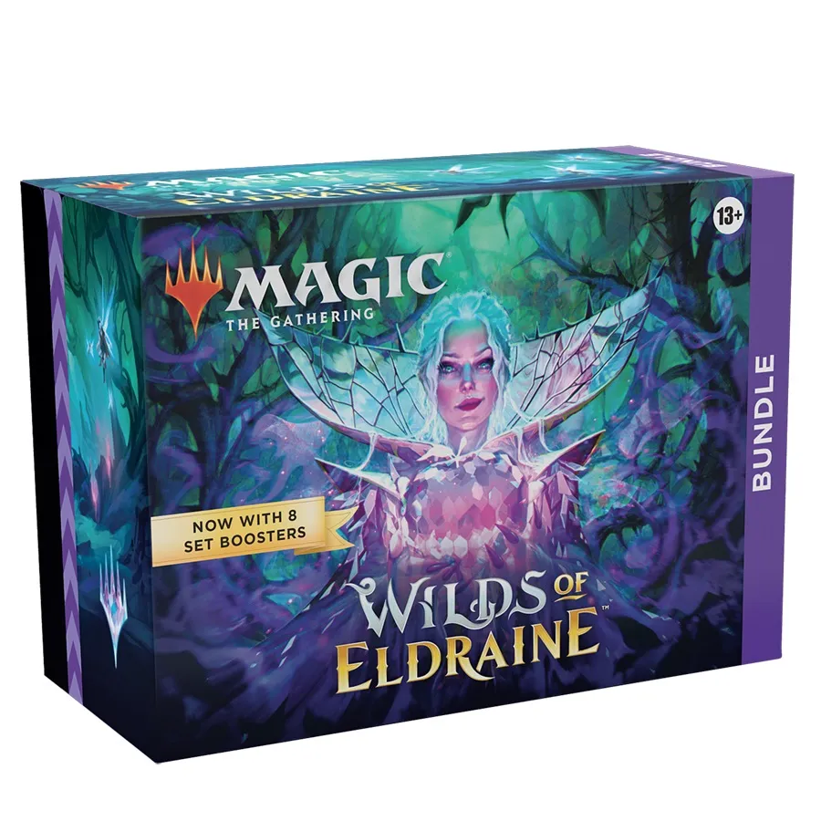 Your next adventure awaits! This Wilds of Eldraine Bundle contains 8 Wilds of Eldraine Set Boosters—the best boosters to open just for fun—plus 1 Traditional Foil card with Bundle-exclusive alternate-art, 40 Basic Land cards (20 Traditional Foils and 20 nonfoils), 1 oversized Spindown life counter, 1 card storage box, and 2 reference cards. Each Set Booster contains 12 Magic cards, 1 Art Card, and 1 token/ad card, or card from “The List” (a special card from Magic's history—found in 25% of packs), with a combination of 1–5 card(s) of rarity Rare or higher and 3–7 Uncommon, 3–6 Common, and 1 Land cards. Every pack contains at least 1 special Borderless card of rarity Uncommon or higher. The Land card is a Full-Art Land in 33% of packs and is Traditional Foil in 20% of packs. A Foil-Stamped Signature Art Card replaces the Art Card in 10% of Set Boosters.