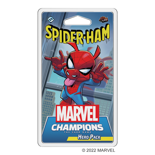 Greetings, citizens! You’ve met high-flying heroes, super-genius scientists, and cosmic sorcerers. You’ve seen awe-inspiring Avengers, grandstanding Guardians, and wondrous Web-Warriors. Now, it’s time for the porcine powerhouse, the spectacular super-pig, the wacky web-slinger, the one and only…Spider-Ham! This cartoon wonder WHAMs his way into players’ games of Marvel Champions: The Card Game with zany aplomb. Utilizing his wacky cartoon physics and goofy antics, Spider-Ham can take hits like a champ and thwart villains’ schemes with all sorts of colorful nonsense. With this Hero Pack, players will find Spider-Ham, his fifteen signature cards, and a full assortment of Justice cards inviting them to ruin the villains’ plans. This pack also includes a bonus modular encounter set featuring the iconic and terrifying Inheritors.