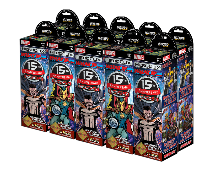 The Marvel HeroClix: 15th Anniversary What If? Booster Brick includes the most iconic Marvel heroes and villains of all time, exactly like you’d expect them to be, and in spectacular alternate versions too. HeroClix fans will be able to have their Punisher become the Sorcerer Supreme, or Daredevil join S.H.I.E.L.D. in ways never before possible on the HeroClix tabletop! What if heroes become villains? What if someone new gains powers? Answer these questions and more by visiting your FLGS to join in the HeroClix 15th Anniversary events and open some Marvel HeroClix: 15th Anniversary What If? Boosters!