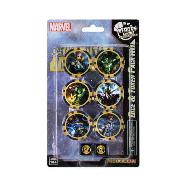The Marvel HeroClix: Avengers Infinity Dice & Token Pack contains two custom dice featuring a custom icon and six action tokens showcasing popular Marvel characters.