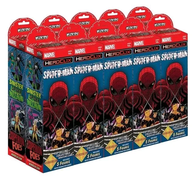 The Marvel HeroClix: Superior Foes of Spider-Man Booster Brick has 70 figures to collect [16 Common (plus one prime), 16 Uncommon (plus one prime), 16 Rare (plus one prime), 12 Super Rare(plus one prime), & 6 Chase] and features a selection of both classic and contemporary Spider-Villians as well as the return of the Serpent Society! The Marvel HeroClix: Superior Foes of Spider-Man Booster Bricks consist of ten 5-figure boosters.
