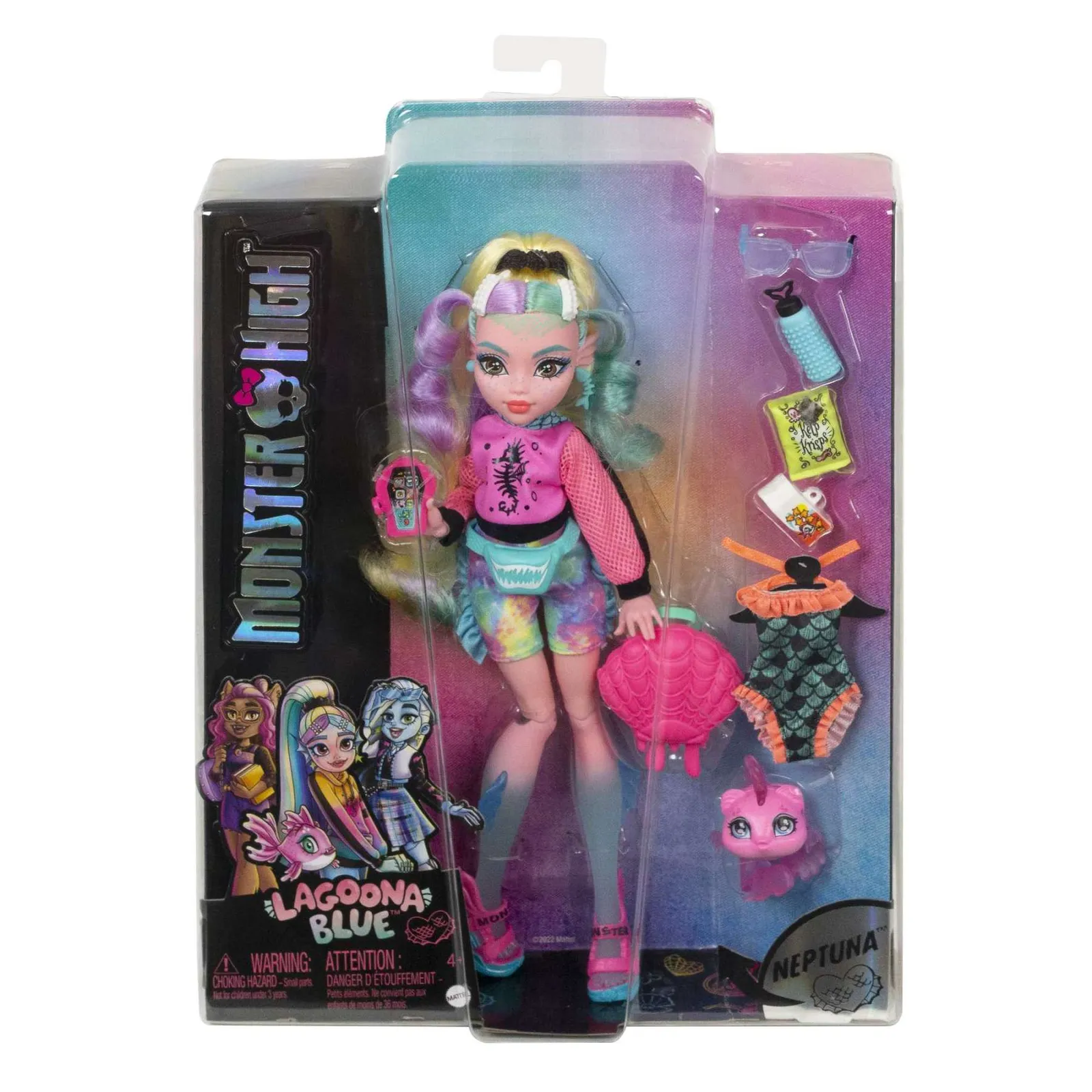 School is back in session, and the Monster High ghouls are showing up in scream-tastic style! Lagoona Blue doll struts down the Monster High hallways in a fin-tastic fashion featuring a hot-pink hoodie with mesh sleeves and a trendy, tie-dye bike shorts romper. Her gore-geous look is complete with a sea monster-inspired waist bag, seashell backpack, colorblock platform sandals and freaky-fabulous fin details inspired by her unique scaritage. Switch up Lagoona Blue doll's look with a 'metallic,' fish scale-detailed swimsuit, and inspire spooktacular storytelling with fearsome accessories and her creepy-cute pet fish, Neptuna! Doll cannot stand alone. Colors and decorations may vary.