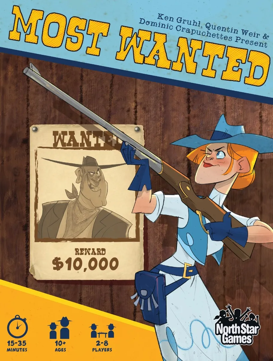 Most Wanted is a very simple western-themed game designed to rustle-up notorious friends and family around the table. All you need is a hankering to take risks, the guts to double-cross, and the desire to bluff a man out of his saddle. Most Wanted blends the strategic risk-taking of a wild-west poker game with the simple thrill of being a notorious outlaw. Playing the highest card - or bluffing with the worst - could mean the difference between a successful train robbery or spending time in the slammer. Players can repent at church to make a new start, or even work some honest labor (gasp!) for bail money. Be the first player to reach 13 points and claim the dubious honor of being MOST WANTED! Most Wanted is great for large groups because it keeps everyone involved at all times (even when it’s not your turn). It takes 15 minutes to play with 2 players, and about 30 minutes with 8 players.