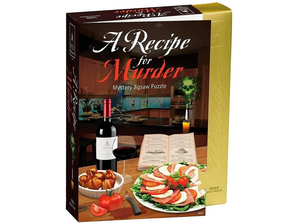 Read the story with everything you need to know about the chef, guests, and the dastardly poising of one of them. Assemble the puzzle and find clues throughout"A Recipe for Murder". Beware, the puzzle is different from what the cover shows. See if you can solve the intoxicating mystery! This puzzle contains 1000 pieces and measures 23 x 29 inches.