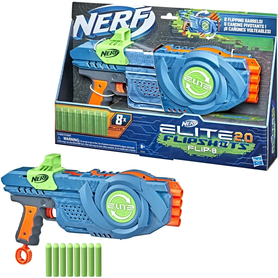 • flip into battle: nerf elite 2.0 flipshots flip-8 blaster features 8 barrels, 4 facing front and 4 facing back. fire darts from the 4 front barrels, then flip the rear barrels forward to keep on firing