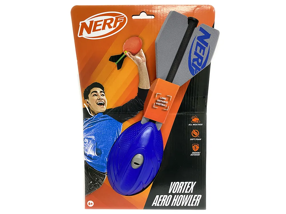 Go long with the NERF Sports Vortex Aero Howler football! This foam ball howls as it flies through the air, and the long-distance tails sends it flying far. A hand grip lets players get a firm grip on the ball to help them better target their passes. Available in 2 different colors (each sold separately)