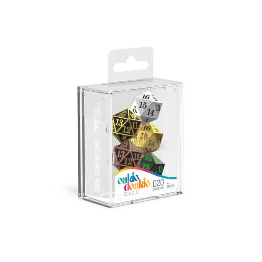 D20 Spindown dice are available in sets of 5 (22 mm) pieces and are packed in strong boxes with extendable shelves so you can easily take them with you and play wherever you want to.