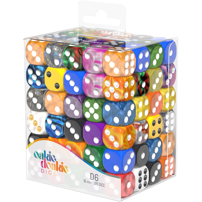 The D6 (16 mm) Retail Pack contains 120 x D6 (16 mm) dice. They come in the following styles: Speckled, Marble, Translucent, Solid and Gemidice.