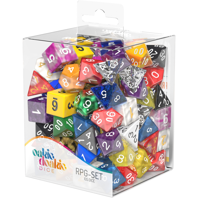 The Role-playing Game Set Retail Pack contains 105 dice of seven different types: D6, D4, 2x D10 (steps of one and steps of ten), D8, D20 and D12. They come in the following styles: Speckled, Marble, Translucent, Solid and Gemidice.