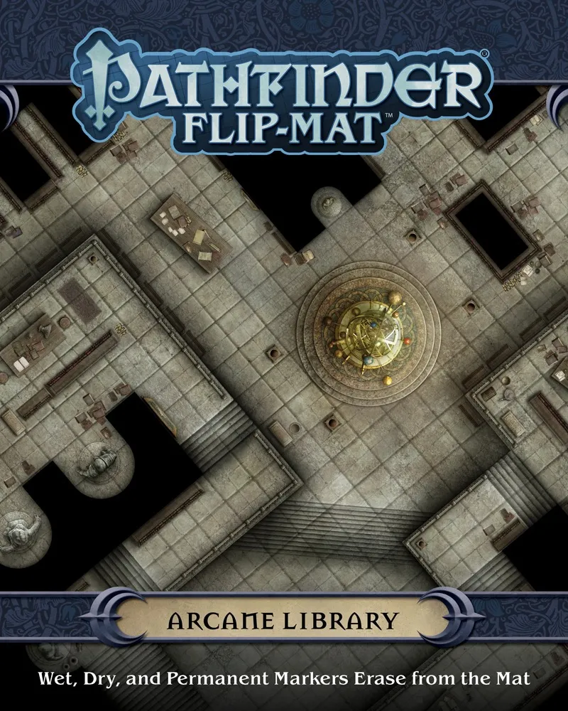 Brave the secrets of the stacks with Pathfinder Flip-Mat: Arcane Library. Each side of the Flip-Mat features a view of an ancient, mysterious trove of knowledge. One side displays a vast and complex library of arcane tomes, complete with study areas and other displays, while the other shows a series of magically separated practice and experimental spaces. This portable, affordable map measures 24" — 30" unfolded, and 8" — 10" folded. Designed for experienced GMs and novices alike, and usable with both dry erase and wet erase markers, Pathfinder Flip-Mats fit perfectly into any Game Master's arsenal! Get to the game faster with Pathfinder Flip-Mat: Arcane Library, and be ready next time your players seek out dangerous knowledge!
