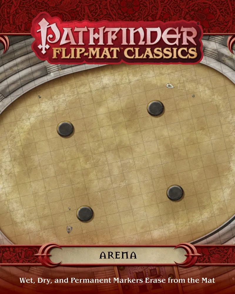 Let the Games Begin! Flip-Mat Classics: Arena brings you two stadiums: one for basic gladiatorial combat and another filled with water for mock naval battles. Featuring both box seats for the local nobles and stands for the common folk, these maps are an exciting addition to any campaign! The most-popular Pathfinder Flip-Mats in history return! These fan-favorite maps feature versatile adventure settings—city streets, forests, ships, taverns, and more—and now they're back for a repeat performance. Durable and lavishly detailed, these essential adventure set pieces are sure to bring excitement to your game table for years to come! A special coating on each Flip-Mat allows you to use wet erase, dry erase, AND permanent markers with ease! Removing permanent ink is easy—simply trace over any permanent mark with a dry erase marker, wait 10 seconds, then wipe off both marks with a dry cloth or paper towel. Each Flip-Mat measures 24" x 30" unfolded, and 8" x 10" folded.