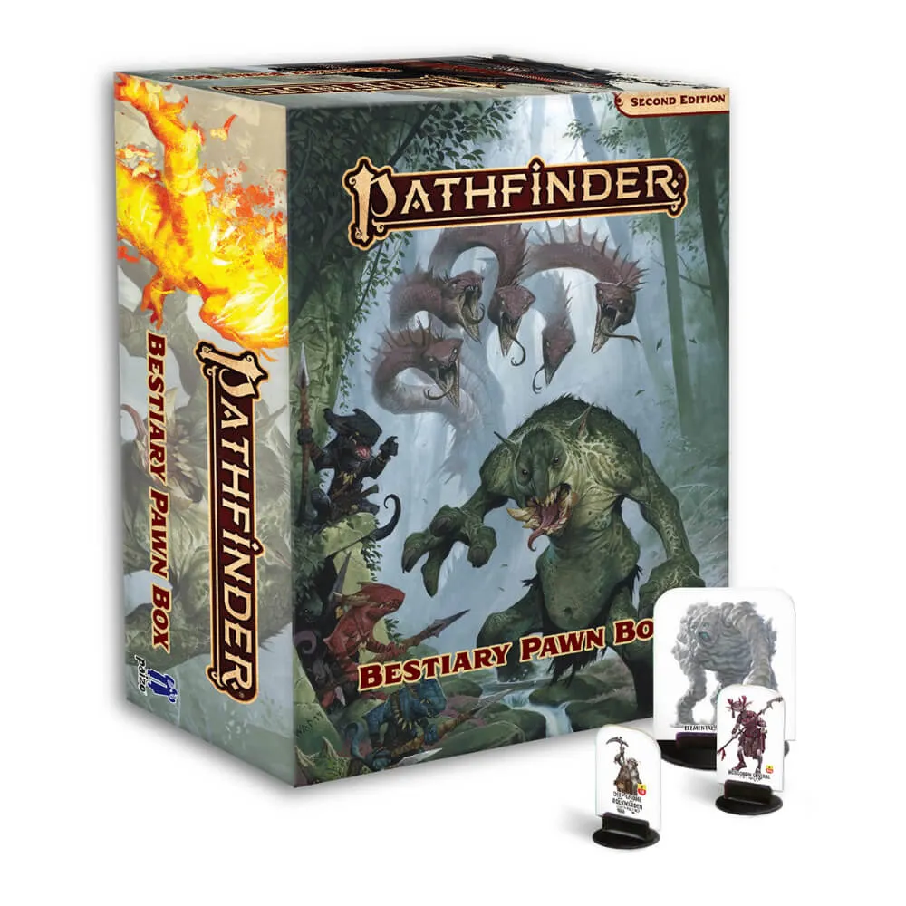 The ferocious foes of the Pathfinder Bestiary come alive on your tabletop with this collection of more than 375 creature pawns for use with the Pathfinder Roleplaying Game or any tabletop fantasy RPG! Printed on sturdy cardstock, each double-sided pawn contains a beautiful full-colour image of a nasty monster from the Pathfinder Bestiary. Each pawn slots into a size-appropriate plastic base, making them easy to mix with traditional metal or plastic miniatures, bringing your Pathfinder campaign to stunning life!