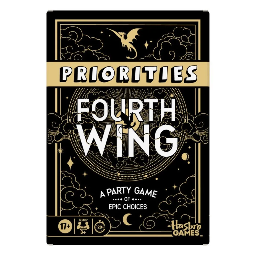 Welcome to Basgiath, cadet! See how well you know your squadmates in this Priorities Fourth Wing Edition game, inspired by the bestselling Empyrean series by Rebecca Yarros! In this game of epic choices, one player—the Wingleader—draws 5 cards featuring favorites from the first 3 Empyrean books: Fourth Wing, Iron Flame, and Onyx Storm. They secretly rank the cards from love to loathe. Everyone else—the Iron Squad—works together to guess the Wingleader's order. It's everyone versus the game!