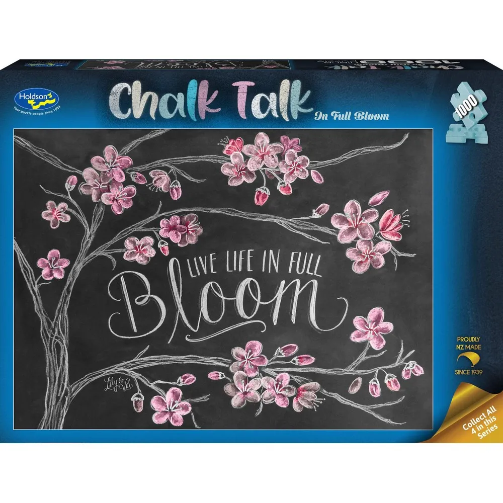 Enjoy puzzling this chalk board image! There are four 1000 piece jigsaw puzzles to choose from (each sold separately) or collect them all: Full Bloom, Moon and Back, Sunshine, To Travel.