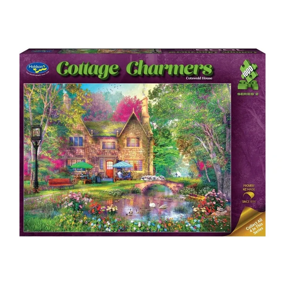 Cottage Charmers S2 features four scenes: Cotswold House, Fishing at the Cottage Lodgefin, Oakwell Cottage and The Woodland Cottagel. Made in New Zealand by Holdson using vegetable based inks and recyclable materials.