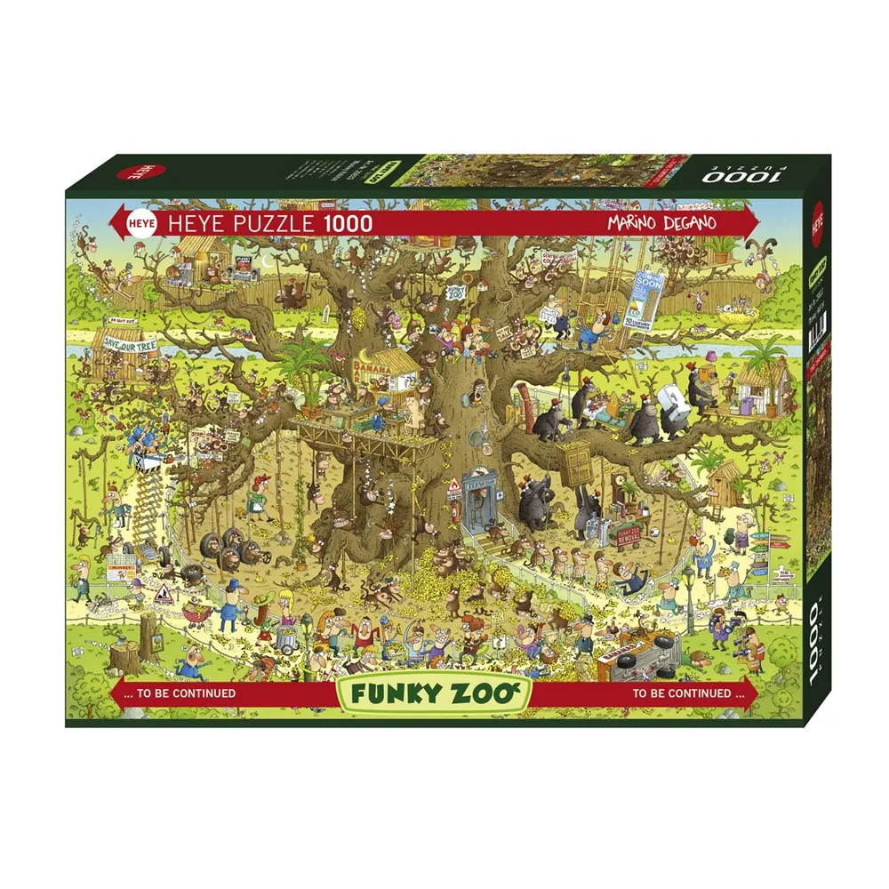 The Funky Zoo Monkey Habitat 1000-piece jigsaw puzzle brings a cheerful and detailed zoo scene to life with playful monkeys and vibrant surroundings.