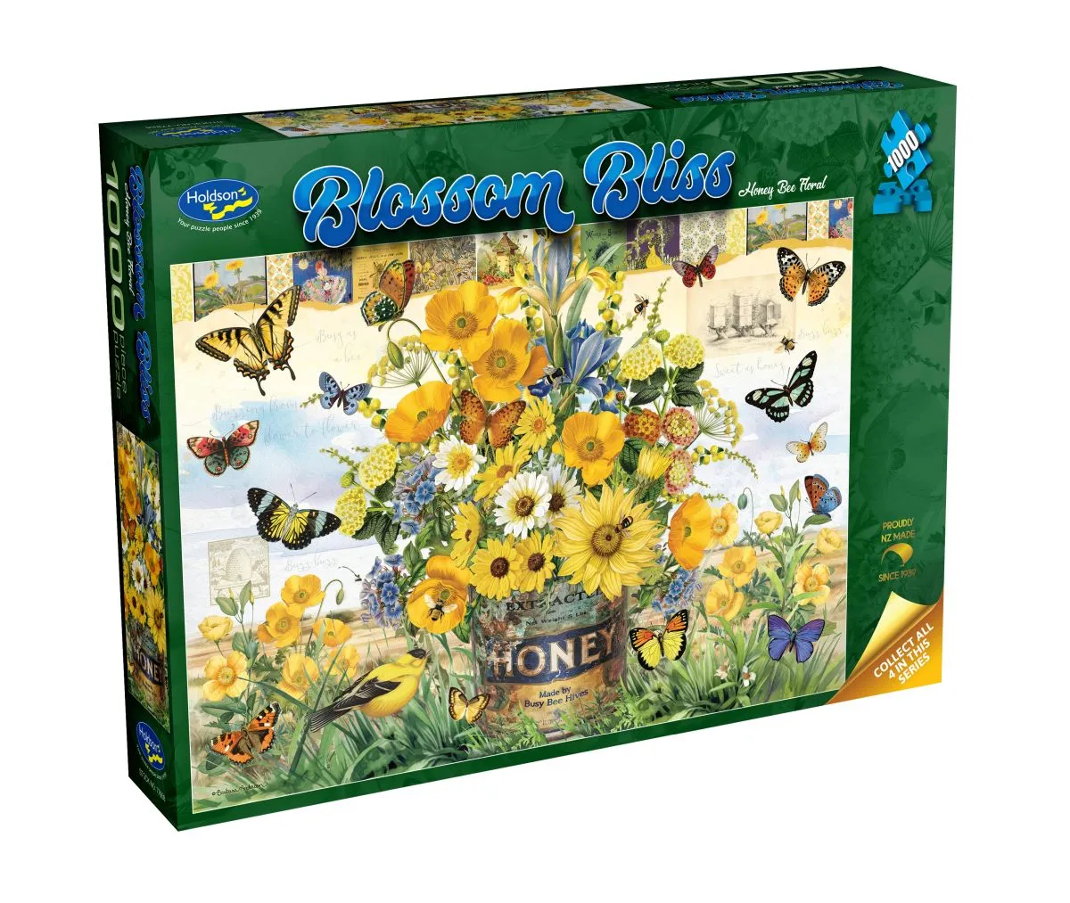 This Holdson Blossom Bliss 1000 piece jigsaw is part of a vibrant puzzle collection manufactured in New Zealand using vegetable-based inks and recyclable materials. Features highly detailed arrangements of flowers to capture nature's beauty.