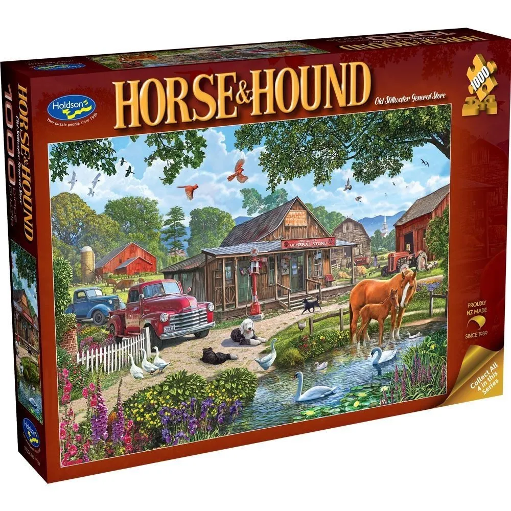 Dive into the world of equestrian elegance with our Horse & Hound themed puzzles by artist Steve Crisp. Each puzzle captures the timeless bond between riders and their loyal canine companions, offering hours of enjoyable and relaxing assembly. This jigsaw puzzle series features four scenes for you to choose from, or collect them all:Autumn Walk, Country Vet, Old Stillwater General Store and Watering Hole.