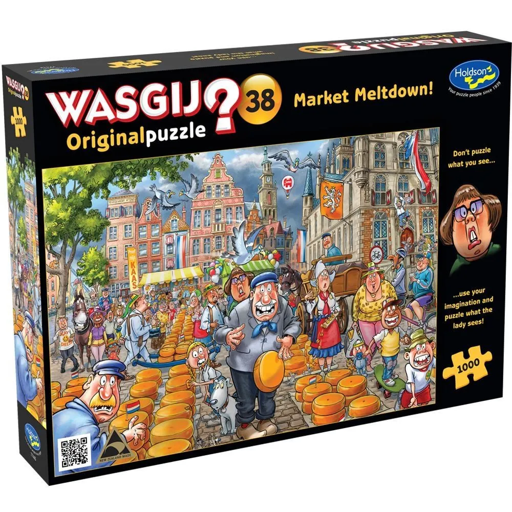 Wasgij Original 38: The Dutch cheese market is busier than ever, with locals and tourists alike gathering to purchase some local delicacies – even the dark clouds can’t dampen their spirits! Luckily for them, the sun has broken through the gloom and started to shine brightly on the market stalls below, but why does the sudden change in weather take everyone by surprise?  What has the cheesemonger seen that’s stopped him in his tracks? That is the image you need to puzzle over.
