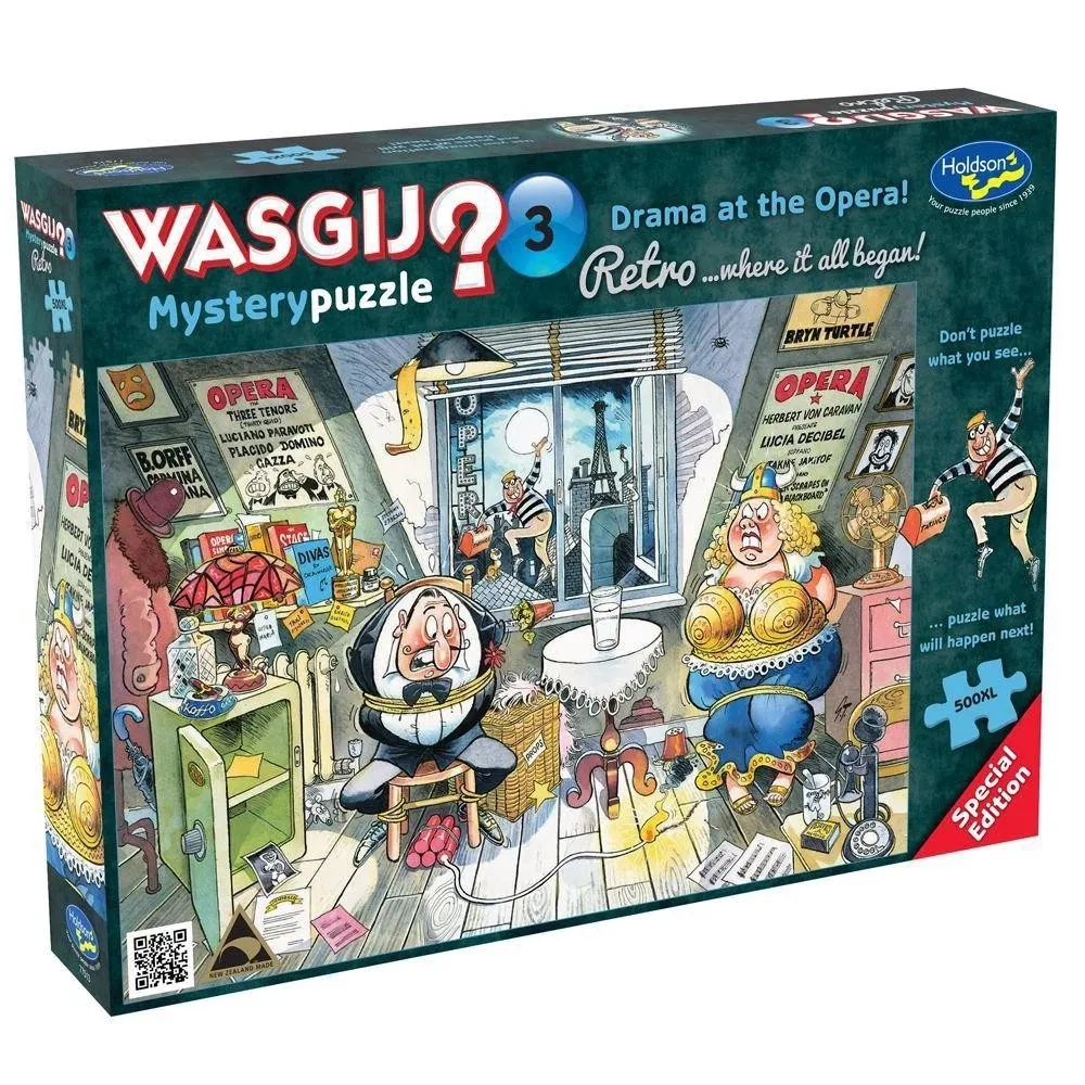 Wasgij Retro Mystery 3: ‘Drama at the Opera!’ is the title of this fantastic Wasgij Mystery 500 XL piece jigsaw puzzle. As the burglar makes his quick get-away he’s left the stars of the show tied up, and while the manager worries about the burning fuse to the dynamite, the Diva is angry about a certain picture which has fallen from the safe.