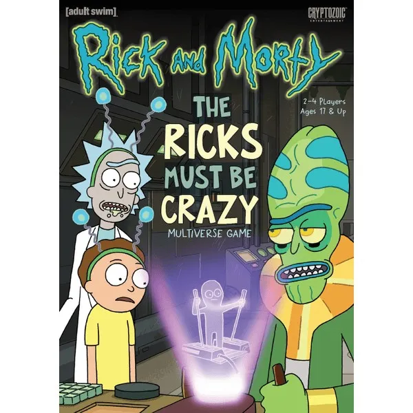 Rick and Morty: The Ricks Must Be Crazy Multiverse Game is an engine-building game (of sorts) that takes place in the four locations, a.k.a. "'verses", from the popular Rick and Morty episode "The Ricks Must Be Crazy": the Rickverse, Microverse, Miniverse, and Teenyverse. Due to time dilation and other pseudo-scientific malarkey, the lower you travel in the 'verses, the greater number of actions you have each round — but some of those lower 'verses are a bit primitive, so the contraptions you build to use all that sweet power on might not work that well!