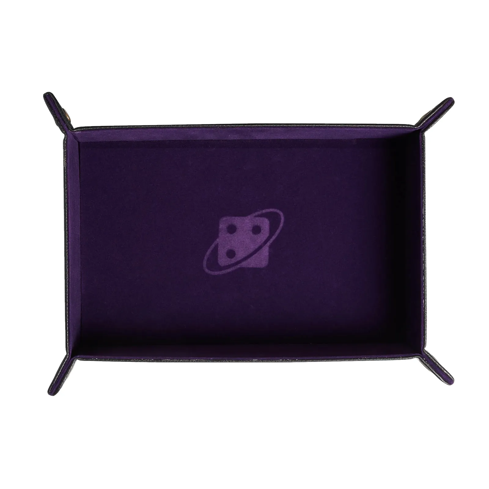 Rectangular dice tray lays flat for transport. Then snap it together to use as a dice tray.  Black leather outside and purple felt inside. Can be reversed.