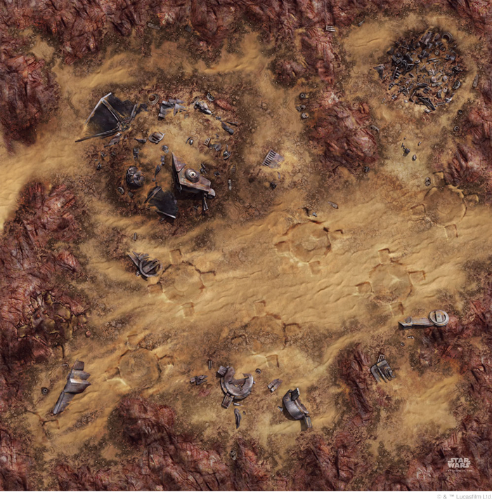 Upgrade your Star Wars™: Legion play area with the Desert Junkyard Gamemat. an approximately 3’ x 3’ rubber mat with a slip-resistant bottom. This mat is the ideal companion to the Desert Ruins Gamemat and the two products combine to make a 3’ x 6’ play area perfect for standard-sized games.