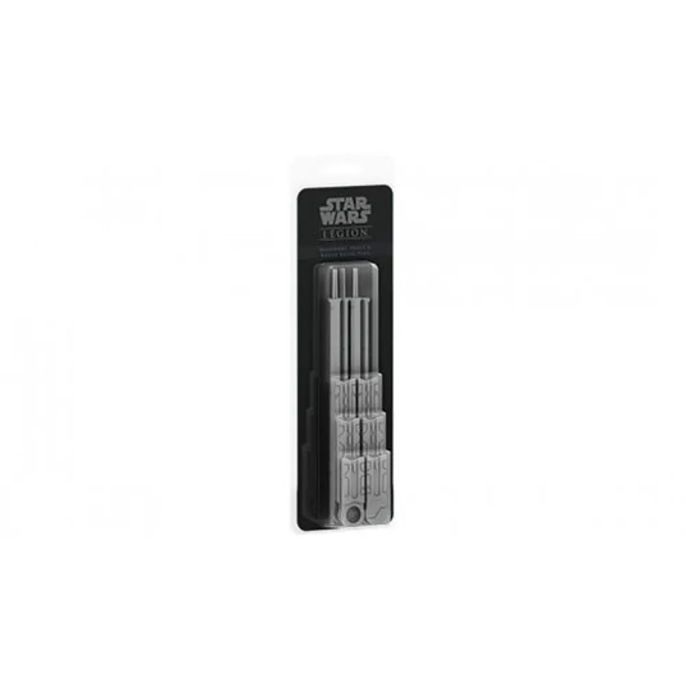 Supplement your games of Star Wars™: Legion with a tool of convenience: extra movement tools and range rulers! The Star Wars: Legion Movement Tools and Range Ruler Pack contains three joined movement tools and one segmented range ruler, identical to the dice contained in the Core Set.