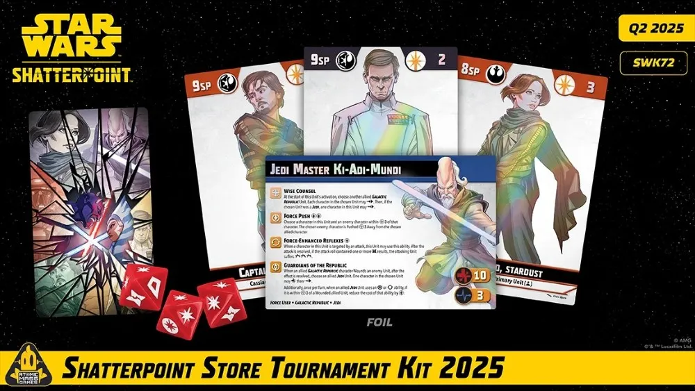 The Star Wars: Shatterpoint – Store Tournament Kit: 2025 will feature special prize cards for players at each round of the event, specially stamped Top 4 versions of the Round 4 card award for top finishers, and a special stat card for the event champion. As the program expands, additional kits will feature prizes such as dice and new Shatterpoint card designs.
